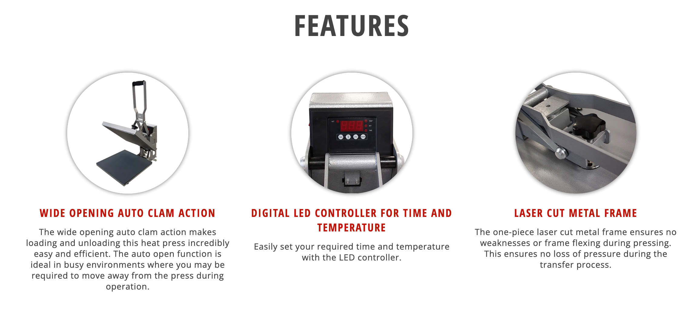 The Studio Auto Clam Press is the perfect solution for customers entering the sign and transfer market for the first time and who work in a fast-paced environment. It’s quick and easy to use and requires minimum operating space and features an auto open function which is ideal in busy environments where you may be required to move away from the press during operation. The auto open function means that at the end of the countdown timer the heat press automatically opens, stopping the transfer process.
