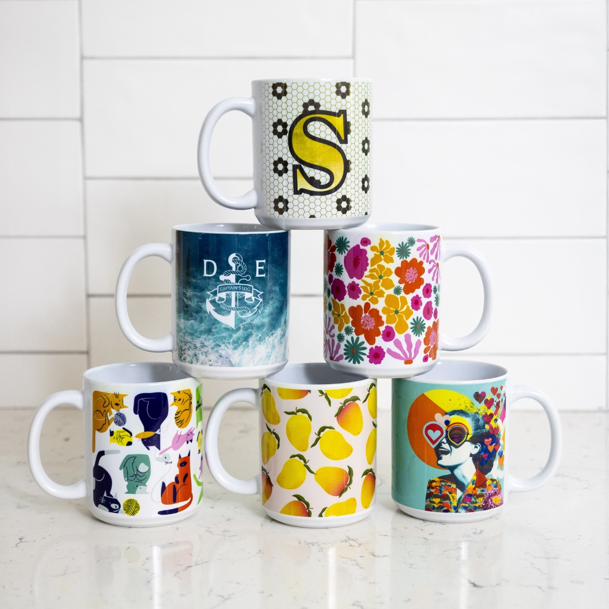 Choose high-quality, sublimation-ready mugs. Options range from classic white mugs to colour inner and handle mugs, perfect for themed designs.