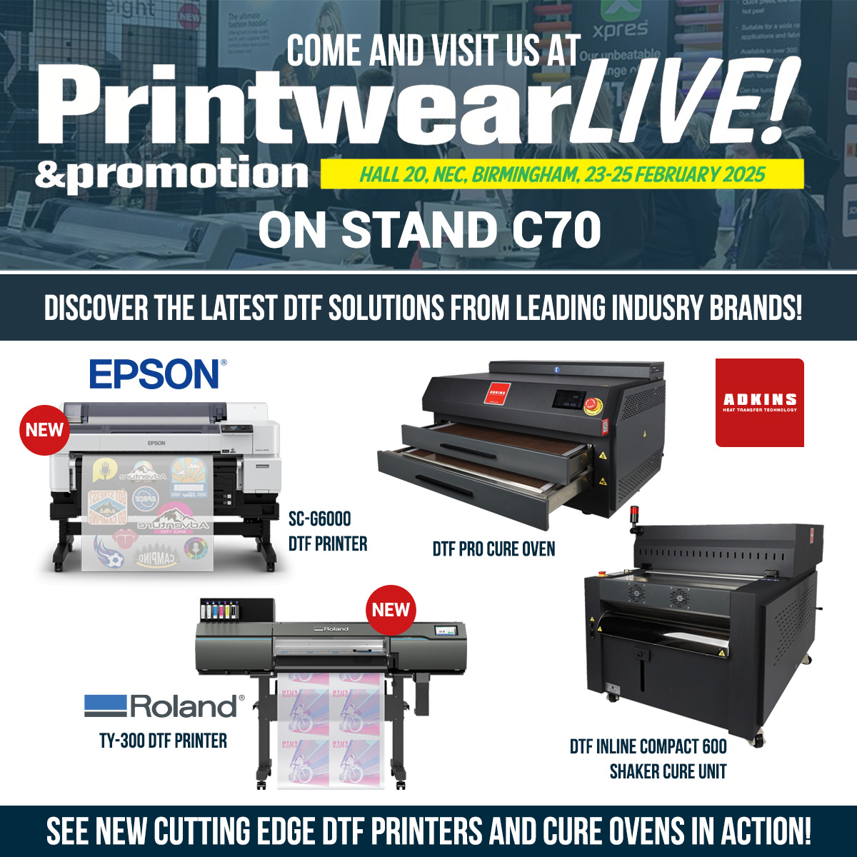 We have everything you need to complete the project with their DTF technology. Visit the stand to look at the all-new Epson SC-G6000 & Roland TY-300 DTF Roll Printers and learn how to streamline your production. Plus, discover the new Adkins DTF curing solutions, including the Pro Cure Oven and DTF Inline Compact 600 Shaker Cure Unit. Don’t forget your DTF essentials and explore the Evolution Film and Power range.
