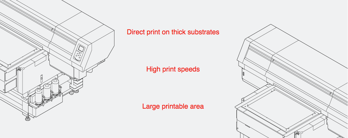 Precise ink drop placement at up to 1,200dpi. 6 staggered print heads. Large 710 x 510mm printable area. Superior image quality control technology (MAPS4 & MFD1). Direct printing on substrates up to 153mm thick. High-end industrial construction for precision production output. Process, White & Clear inks plus Primer. High speed printing – up to twice the speed of previous models.