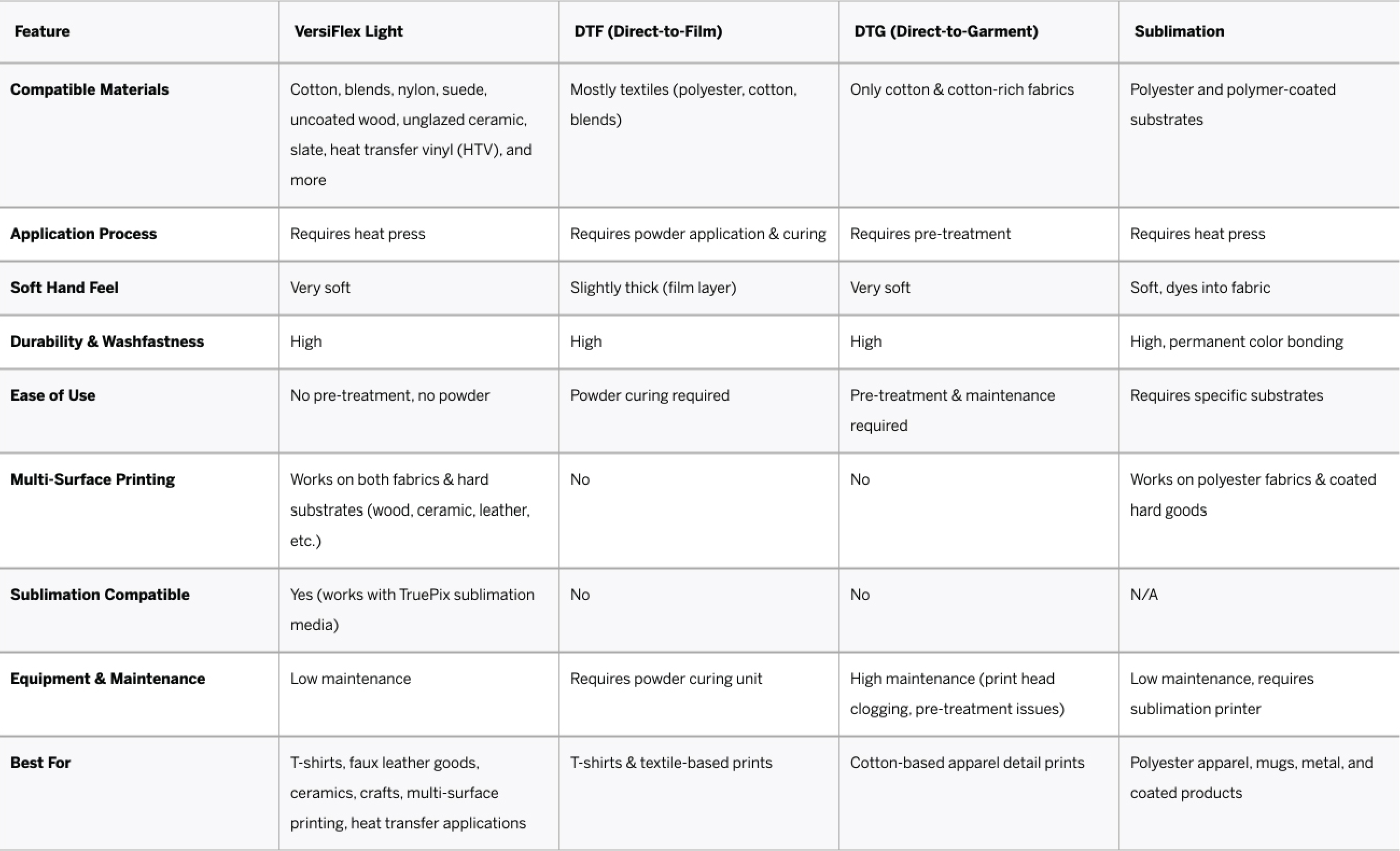 Yes! VersiFlex is a completely new technology, designed from the ground up to offer the best of multiple decorating methods—including DTF, DTG, sublimation, and HTV—while eliminating many of their limitations. The patented VersiFlex decorating system features unique formulations that enable printing on a wide range of materials, including natural fabrics, uncoated wood, and poly-coated blanks— all with one single, affordable system.